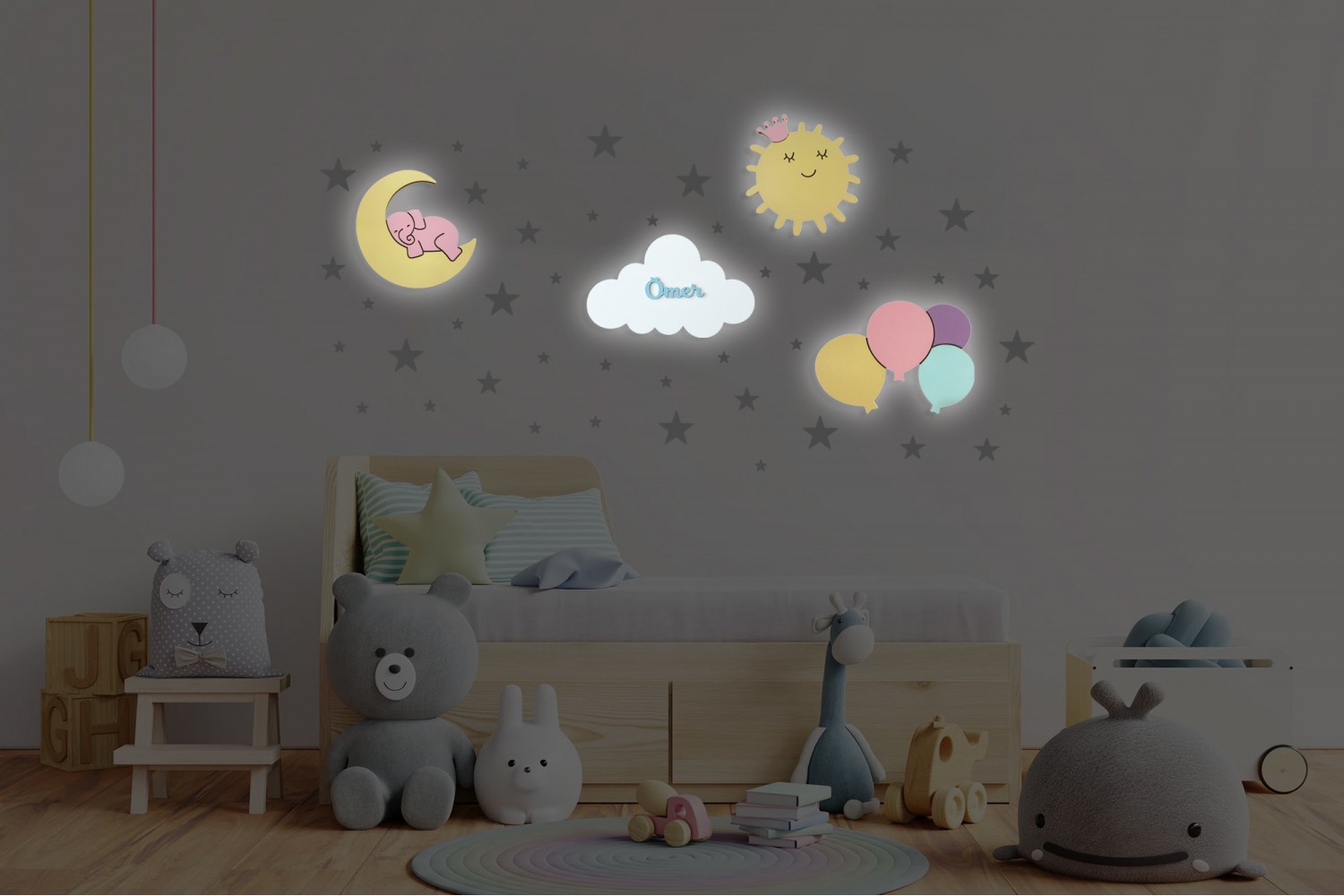 Her gece lambası, doğal boyalarla özenle elde boyanmıştır ve benzersiz, yumuşak bir görünüm sunar. Her parçayı özel kılan bu el işçiliği, çocuğunuzun odasına büyülü bir dokunuş katar.
