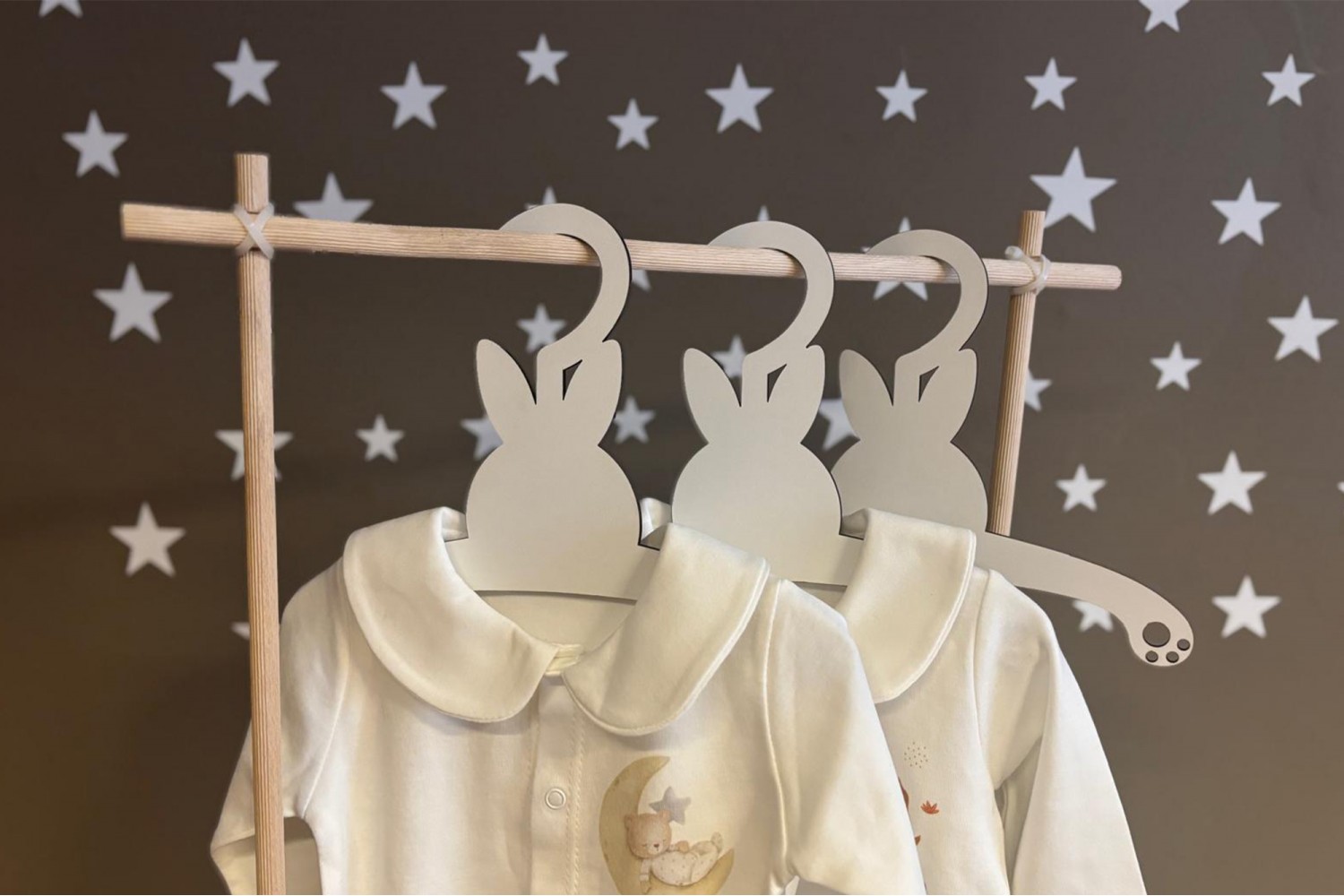 Doğal ahşabın sıcaklığı ve sevimli tavşan formunun buluştuğu bu bebek elbise askısı, miniklerin kıyafetleri için hem şık hem de zarif bir çözüm sunar. Bebek odalarına uyum sağlayan sade tasarımıyla dekoratif bir görünüm kazandırırken, kıyafetlerin formunu korumaya yardımcı olur.