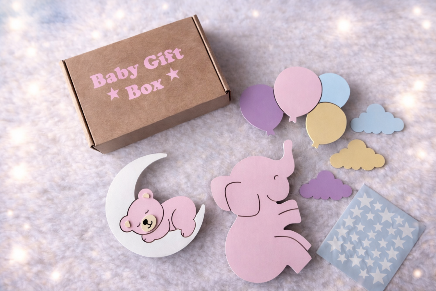 El boyaması ay üzeri ayıcık lamba, fil lamba, çoklu balon lamba ahşap bulut süsler ve yıldız stickerlar ile bebeğin odasını ilk günden sıcacık bir masal köşesine dönüştürür.