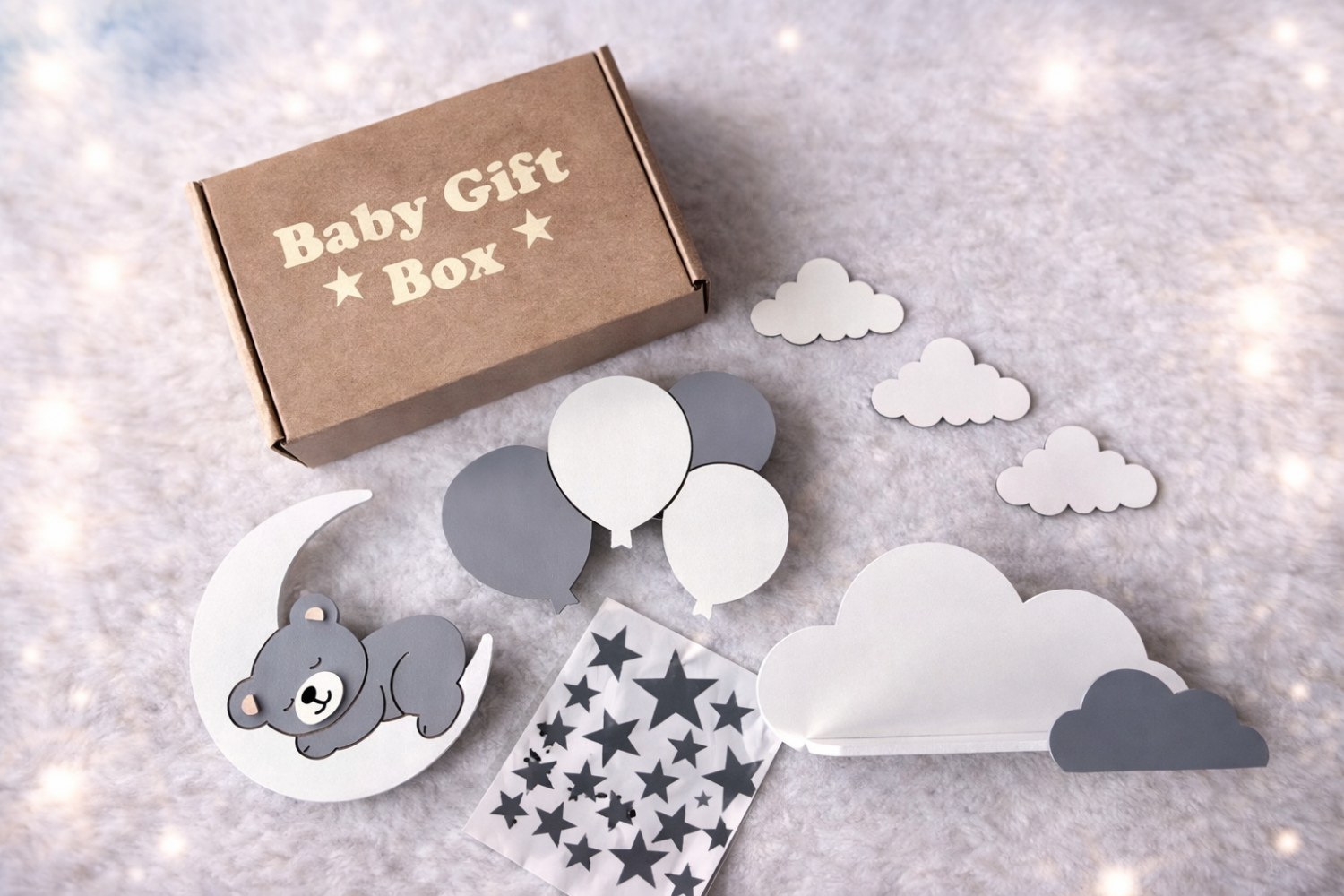 Gri ve beyaz tonlarındaki bu özel set, yumuşak günışığı tonundaki ışığıyla bebeğin kendini güvende hissetmesine ve huzurla uyumasına yardımcı olur; aynı zamanda yıllarca saklanacak duygusal bir hatıra yaratır. Baby shower, hastane ziyareti ya da ilk ziyaret için; kutusuyla hazır, şık ve gerçekten anlamlı bir hediyedir.