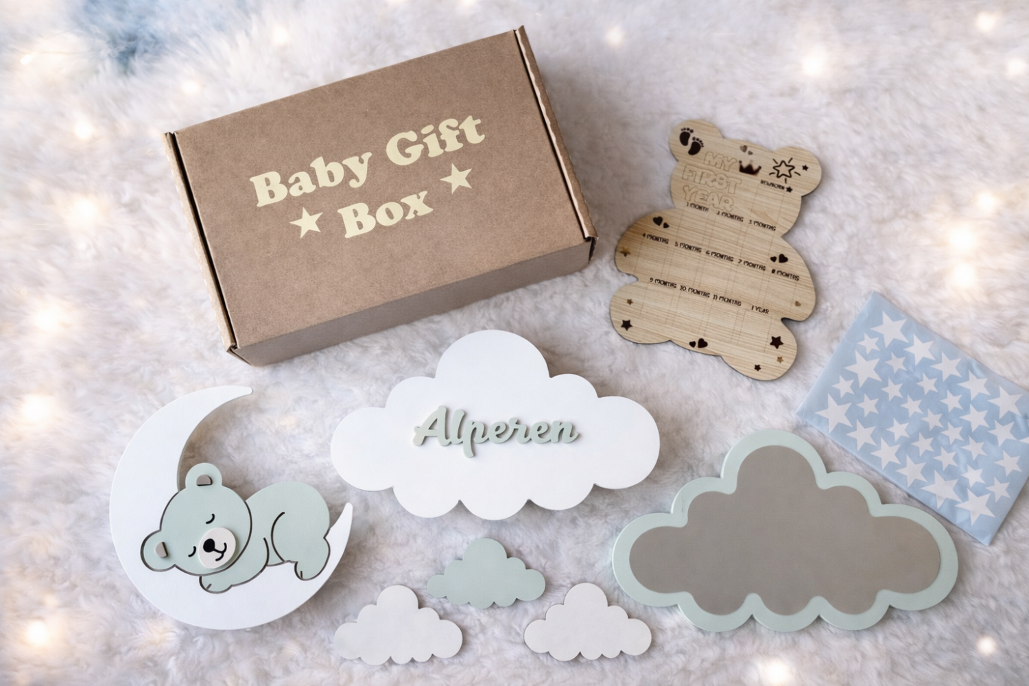 El boyaması ay üzeri ayıcık lamba, bebeğin ismine özel bulut lamba, kırılmaz akrilik bulut ayna, 12 aylık ahşap ayıcık fotoğraf panosu, ahşap bulut süsler ve yıldız stickerlar ile bebeğin odasını ilk günden sıcacık bir masal köşesine dönüştürür.