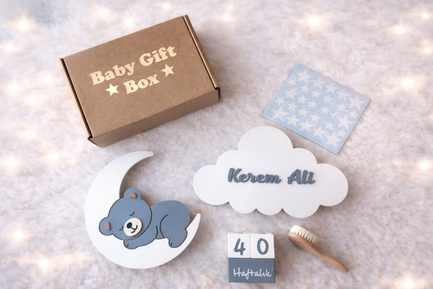 El boyaması ay üzeri ayıcık lamba, bebeğin ismine özel bulut lamba, ahşap anı küpleri, ahşap bebek saç fırçası, ahşap bulut süsler ve yıldız stickerlar ile bebeğin odasını ilk günden sıcacık bir masal köşesine dönüştürür.