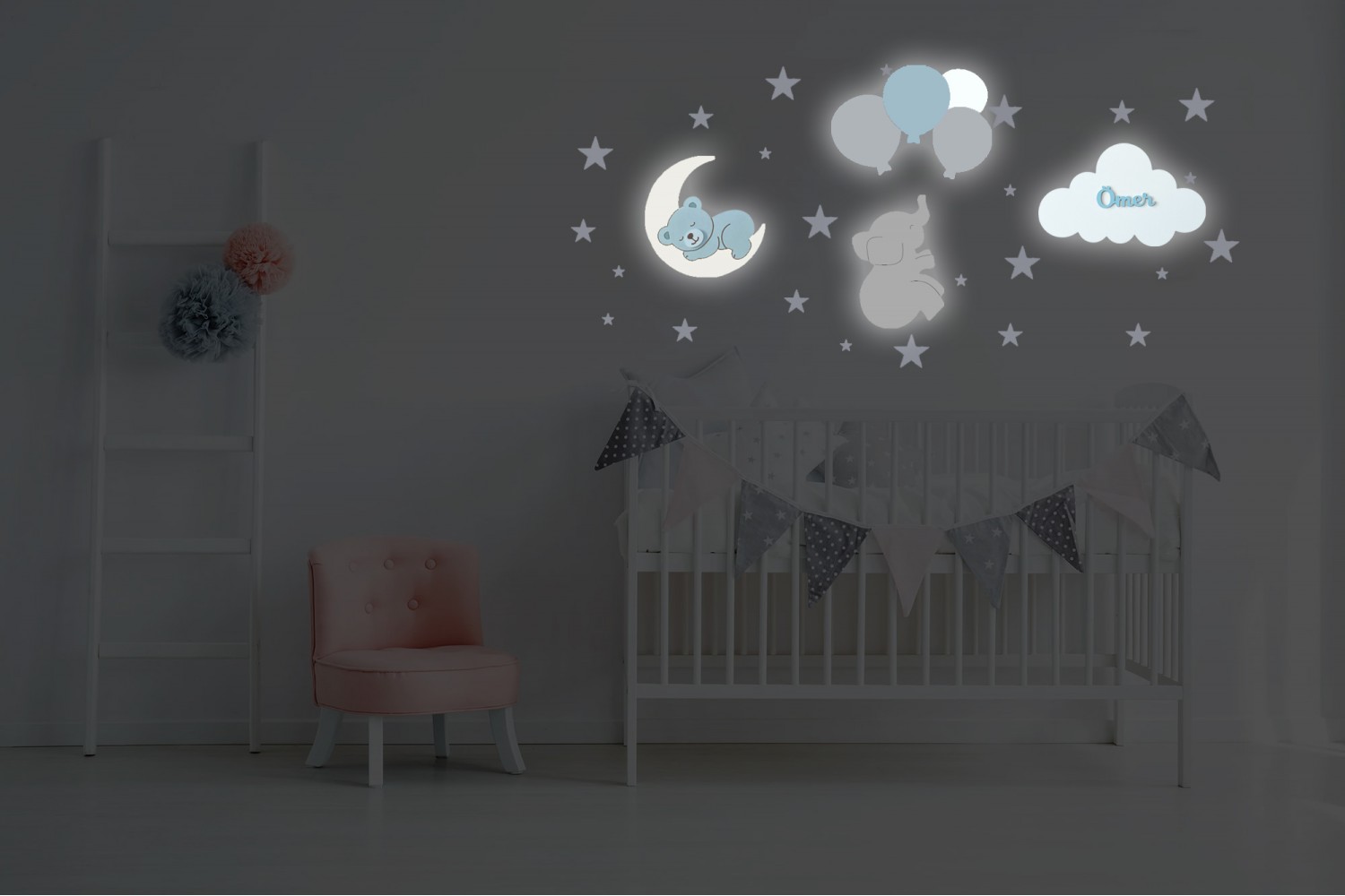1 Beyaz Ay Üzeri Mavi Ayıcık Lamba
