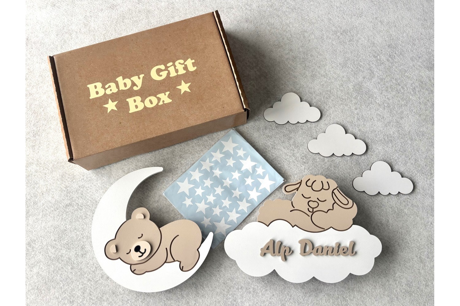 El boyaması ay üzeri ayıcık lamba, bebeğin ismine özel bulut üzeri kuzu lamba, ahşap bulut süsler ve yıldız stickerlar ile bebeğin odasını ilk günden sıcacık bir masal köşesine dönüştürür.