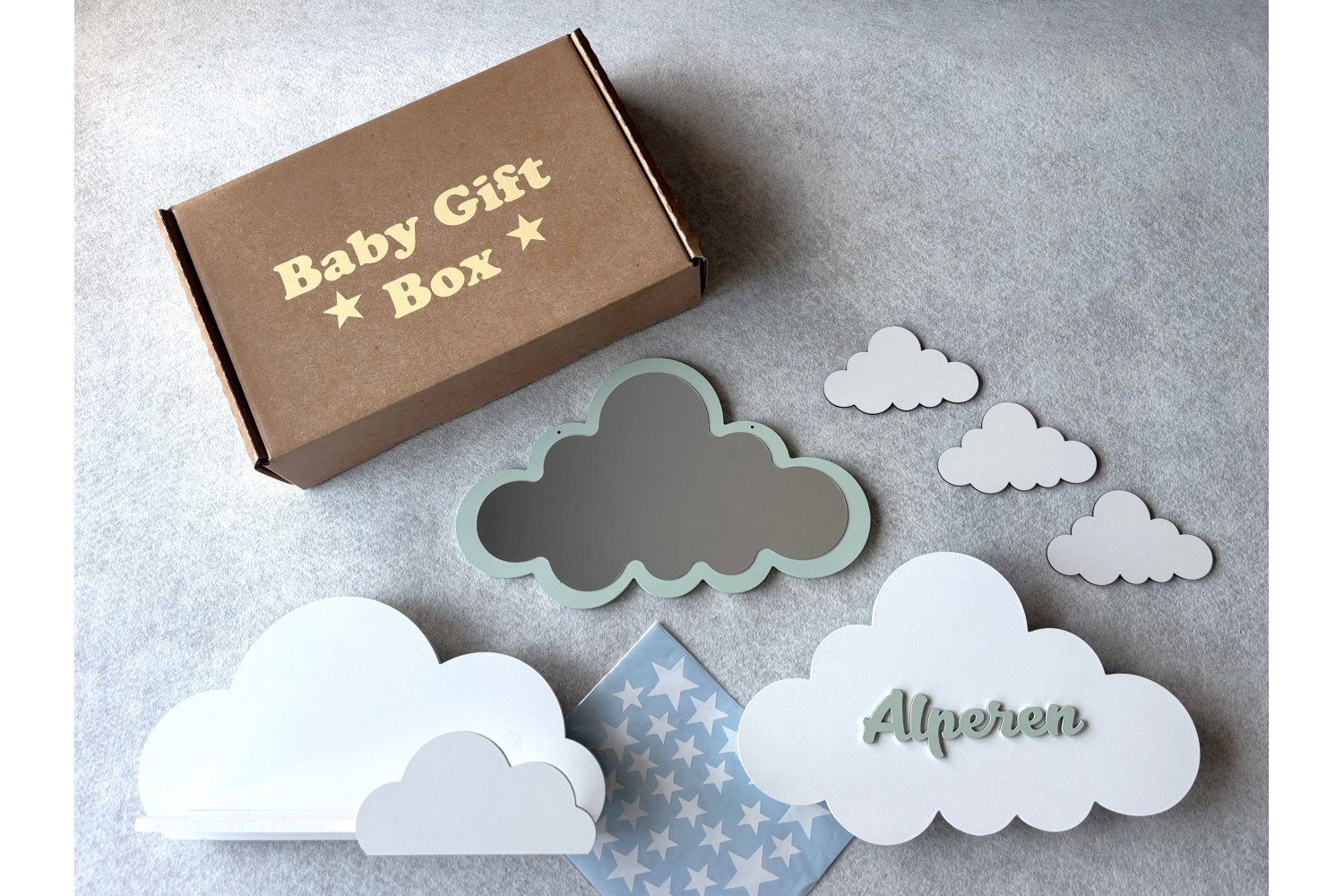El boyaması bulut raf lamba, isme özel bulut lamba, kırılmaz akrilik bulut ayna, ahşap bulut süsler ve yıldız stickerlar ile bebeğin odasını ilk günden sıcacık bir masal köşesine dönüştürür.