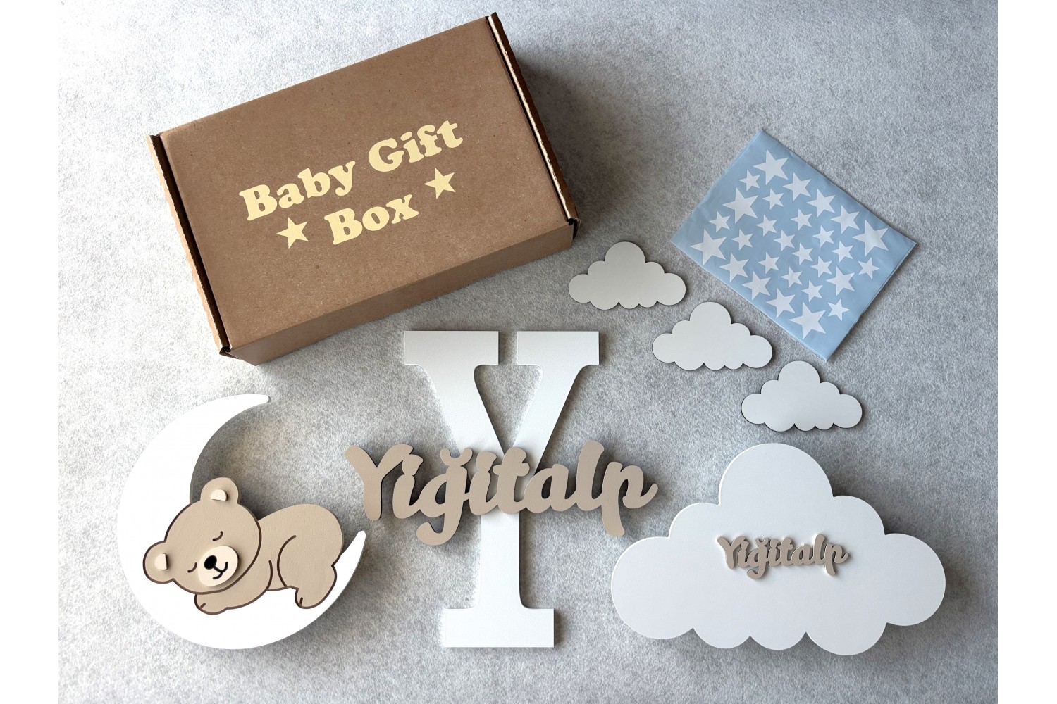 El boyaması ay üzeri ayıcık lamba, bebeğin ismine özel bulut lamba ve kapı süsü, ahşap bulut süsler ve yıldız stickerlar ile bebeğin odasını ilk günden sıcacık bir masal köşesine dönüştürür.