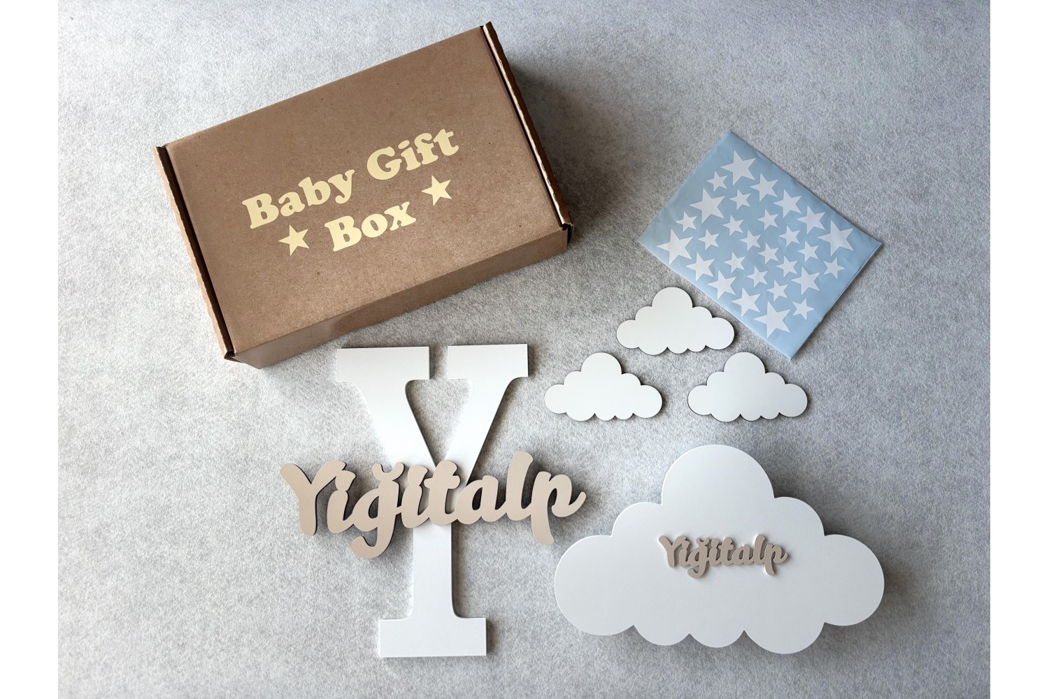 El boyaması bebeğin ismine özel bulut lamba ve kapı süsü, ahşap bulut süsler ve yıldız stickerlar ile bebeğin odasını ilk günden sıcacık bir masal köşesine dönüştürür.