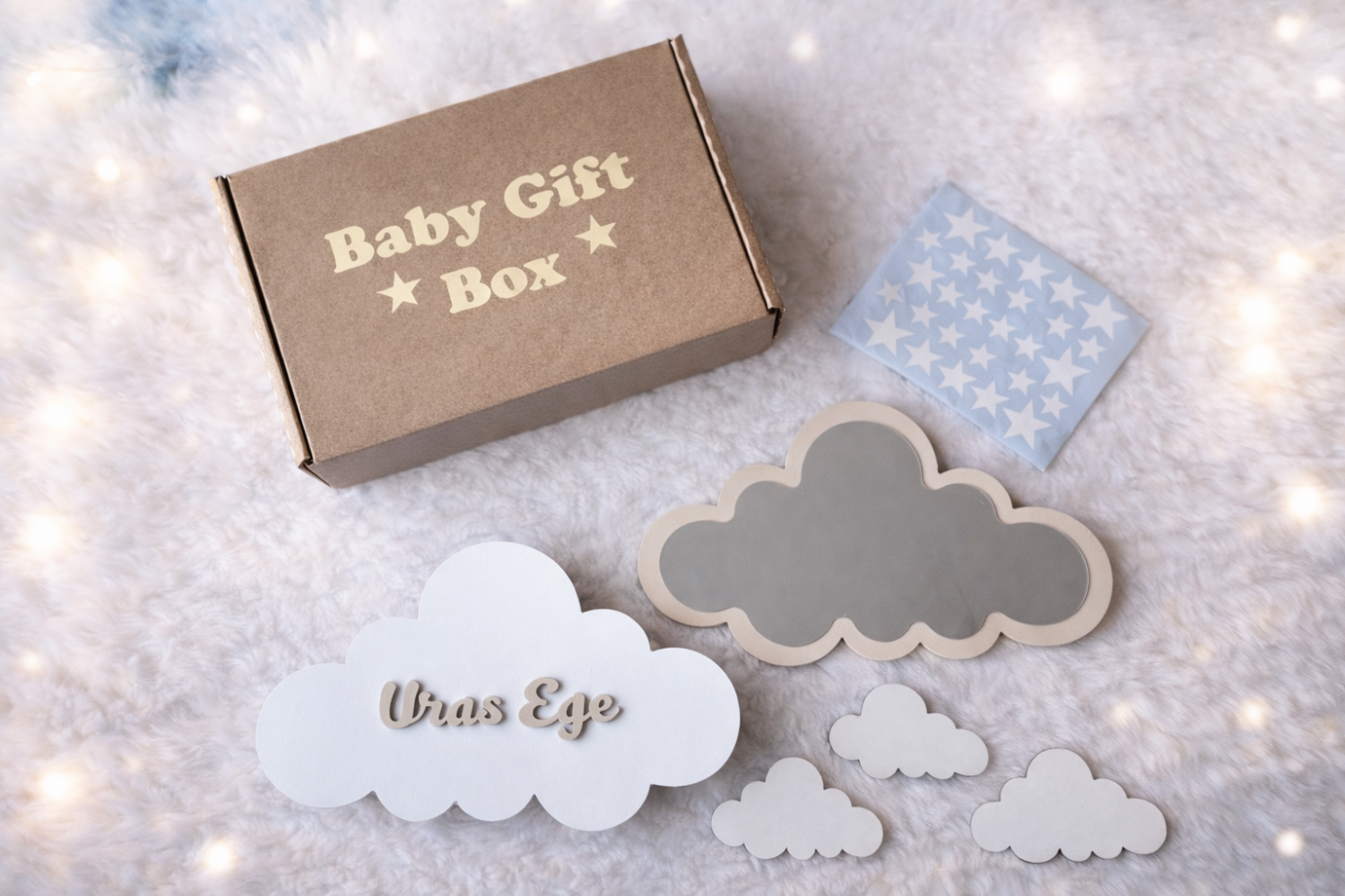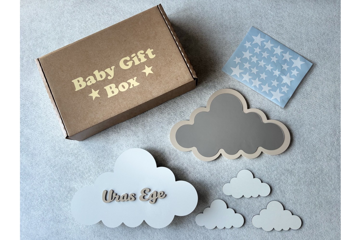El boyaması bebeğin ismine özel bulut lamba, kırılmaz akrilik bulut ayna, ahşap bulut süsler ve yıldız stickerlar ile bebeğin odasını ilk günden sıcacık bir masal köşesine dönüştürür.