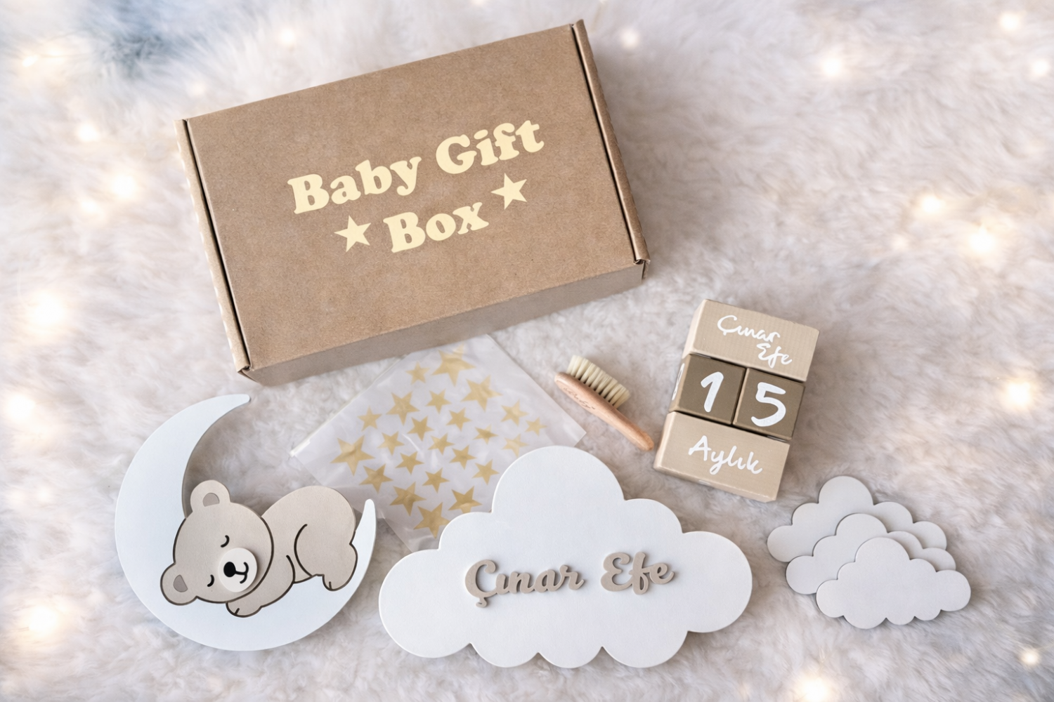 El boyaması ay üzeri ayıcık lamba, bebeğin ismine özel bulut lamba ve ahşap anı küpleri, ahşap bebek saç fırçası, ahşap bulut süsler ve yıldız stickerlar ile bebeğin odasını ilk günden sıcacık bir masal köşesine dönüştürür.